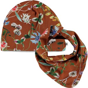 Bruine babymuts en slabbetje met een print van wilde bloemen. Het slabbetje heeft een drukknoop aan de achterkant.
