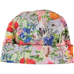 Zachte, elastische muts in een dubbele laag met een bloemenprint. De boord kan worden omgeslagen.