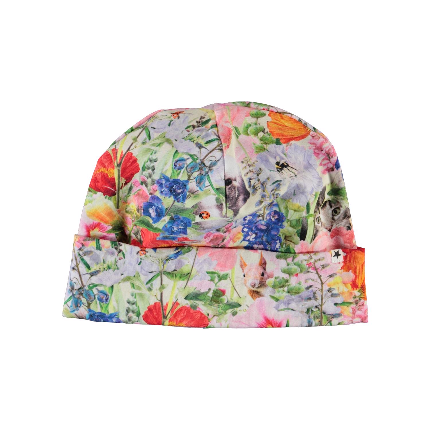 Zachte, elastische muts in een dubbele laag met een bloemenprint. De boord kan worden omgeslagen.