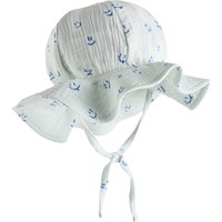 Lichtblauwe zonnehoed voor de kleintjes, gemaakt van zachte, biologische katoenen mousseline met een vrolijke print. Het is licht en luchtig met een rand en linten om het op zijn plaats te houden.
