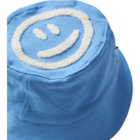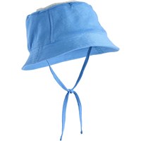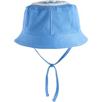 Blauwe zonnehoed gemaakt van biologisch katoen. Het heeft een leuk kunstwerk bovenop en strikjes onder de kin om het op zijn plaats te houden.