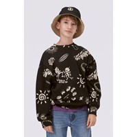 Omkeerbare vissershoed. De ene kant van de hoed is zwart, de andere kant beige. Beide zijden hebben geborduurde peace tekens.
