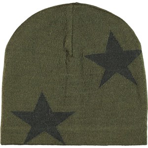 Groen gebreide muts in zacht wol met intarsia sterren en een ribboord aan de onderkant.