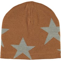 Bruine muts in een zachte wolmix met intarsia-sterren en rib aan de onderkant.