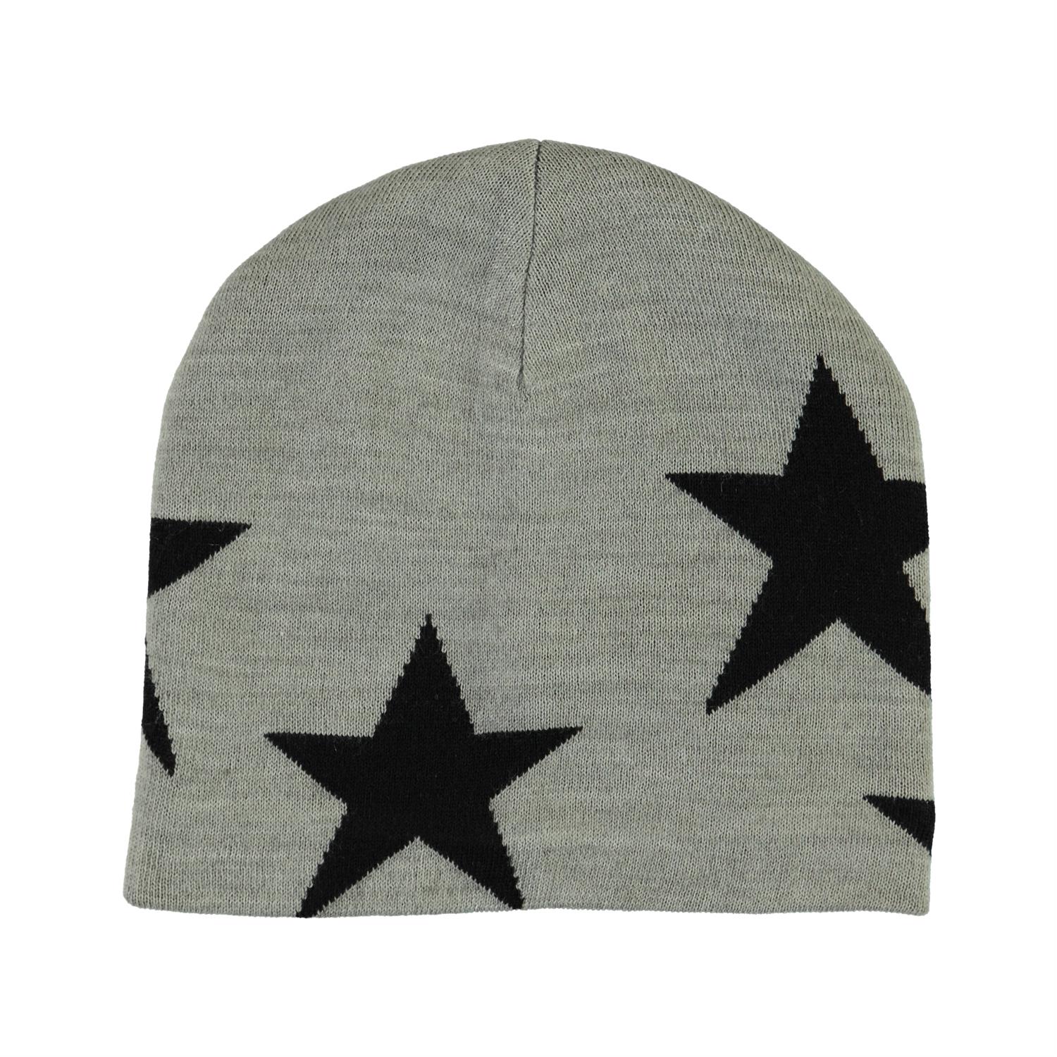 Grijze muts in een zachte wolmix met intarsia-sterren en rib aan de onderkant.