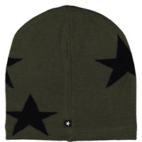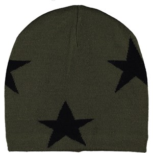 Groene gebreide muts met intarsia sterren. De muts is gemaakt van een zachte wolmix en heeft een ribboord.