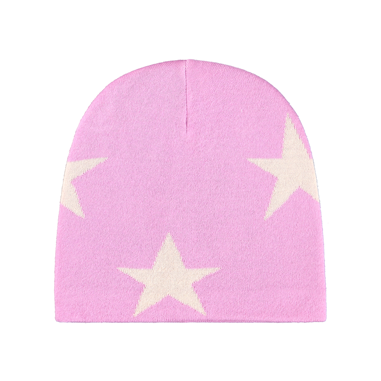 Roze gebreide muts met crèmekleurige sterren voor kinderen.