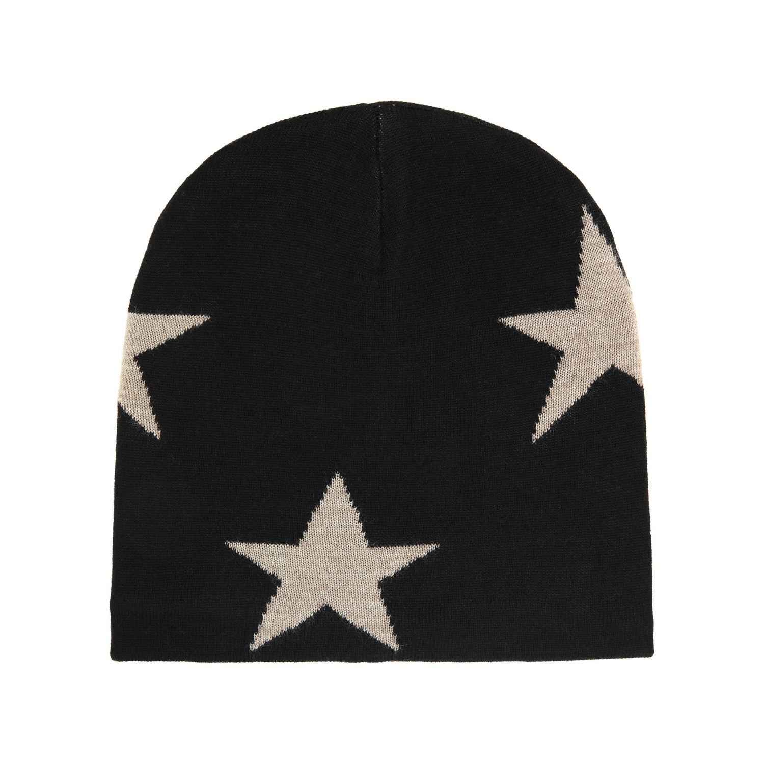 Zwarte gebreide muts met een beige sterrenpatroon gemaakt van een zachte wolmix.