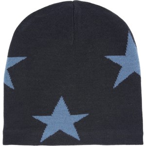 Donkerblauwe gebreide muts met een blauw sterrenpatroon gemaakt van een zachte wolmix.