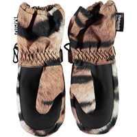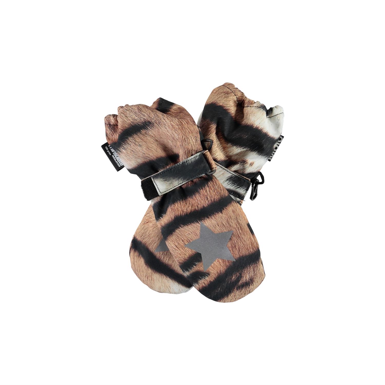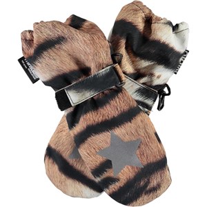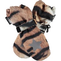 Waterdichte en ademende wanten met 3M ™ Thinsulate ™ isolatie in een tijgerprint. De wanten hebben een sterreflector op de bovenkant van de hand. Ze hebben elastische en verstelbare klittenband rond de polsen. Houdt er rekening mee dat de bovenkant van de want op dit model iets langer is dan op Mitzy, dus er zal geen opening zijn tussen de want en de opening van de mouw van de jas. Dit product heeft een waterbestendige, PFC-vrije oppervlaktebehandeling (bevat geen bijv. PFOS, PFOA, enz.). Waterkolomdruk: 10.000 mm. Ademend: 8.000 g / m2 / 24 uur. Maten 1-2 jaar hebben ook ritsen bij de manchetten. Let op vanaf maat 1-2 jaar hebben de handschoenen een ritssluiting in de kuit i.p.v. klittenband.