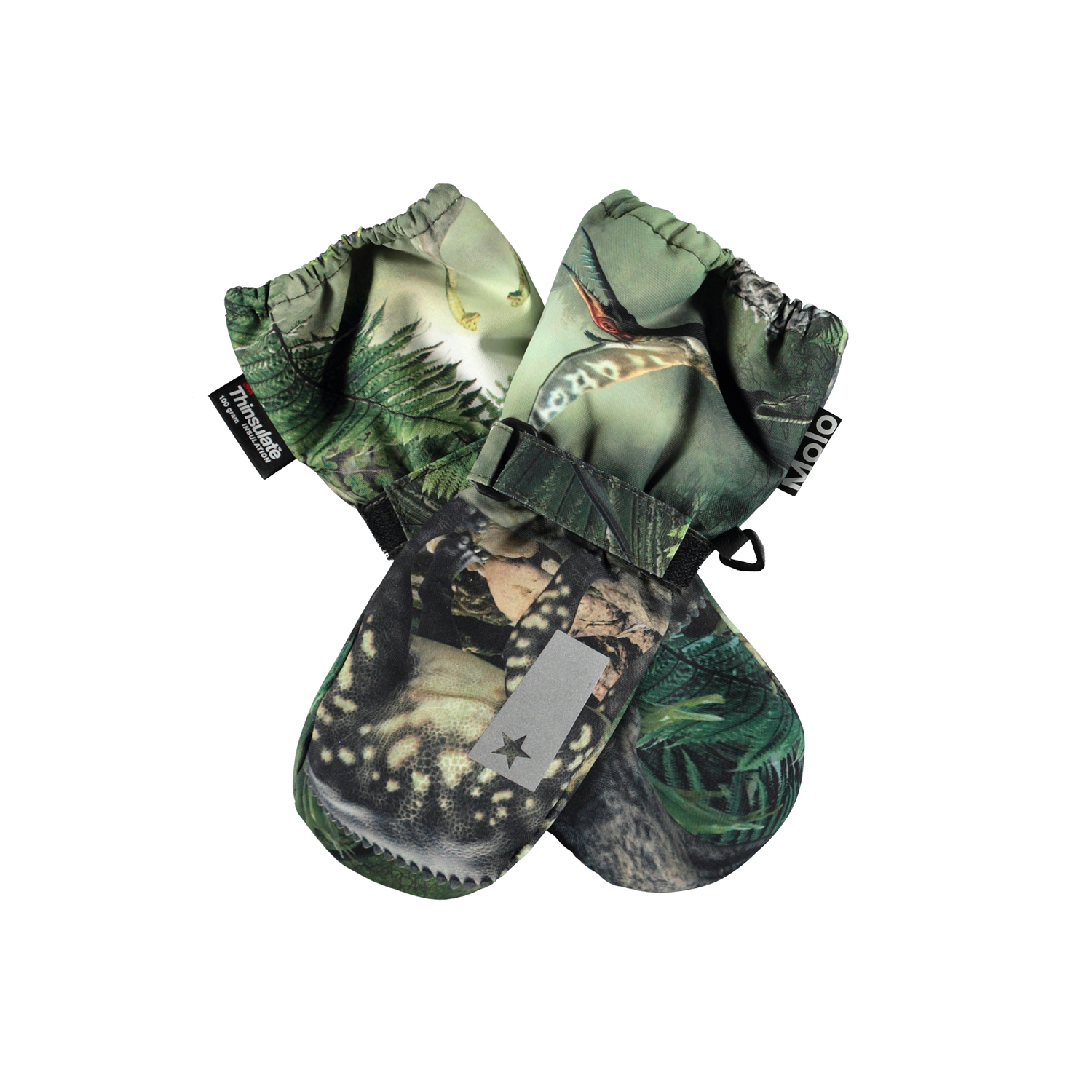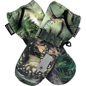 Groene waterdichte en ademende wanten met dinosaurusprint en met 3M™ Thinsulate™ voering. De wanten hebben sterreflectoren aan de bovenkant van de hand, elastisch en verstelbaar klittenband bij de polsen. De buitenstof is gemaakt van 45% gerecycled polyester, de 3M™ Thinsulate™ voering is gemaakt van 78% gerecycled polyester en de binnenstof is gemaakt van 100% gerecycled polyester. Houd er rekening mee dat de manchet van dit model iets langer is dan die van Mitzy, zodat er geen opening is tussen de wanten en de jasmouw. Dit product heeft een waterbestendige, PFC-vrije oppervlaktebehandeling (Bevat bijvoorbeeld geen PFOS, PFOA, etc). Waterkolomdruk: 10.000 mm. Ademend: 8.000 g/m2/24u. Maat 1-2 jaar heeft een rits in de manchet in plaats van de klittenbandsluiting.
