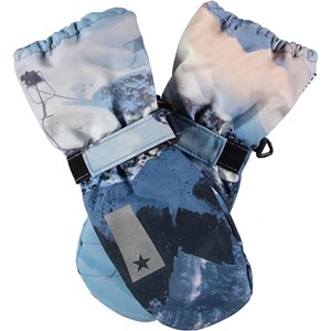 Donkerblauwe, waterdichte en ademende wanten met bergprint en 3M™ Thinsulate™ isolatie. De wanten hebben een reflector aan de voorkant, evenals elastiek en verstelbaar klittenband rond de pols. Let op dat de manchet van dit model iets langer is dan die van Mitzy, dus er is geen opening tussen de wanten en de mouw van de jas.