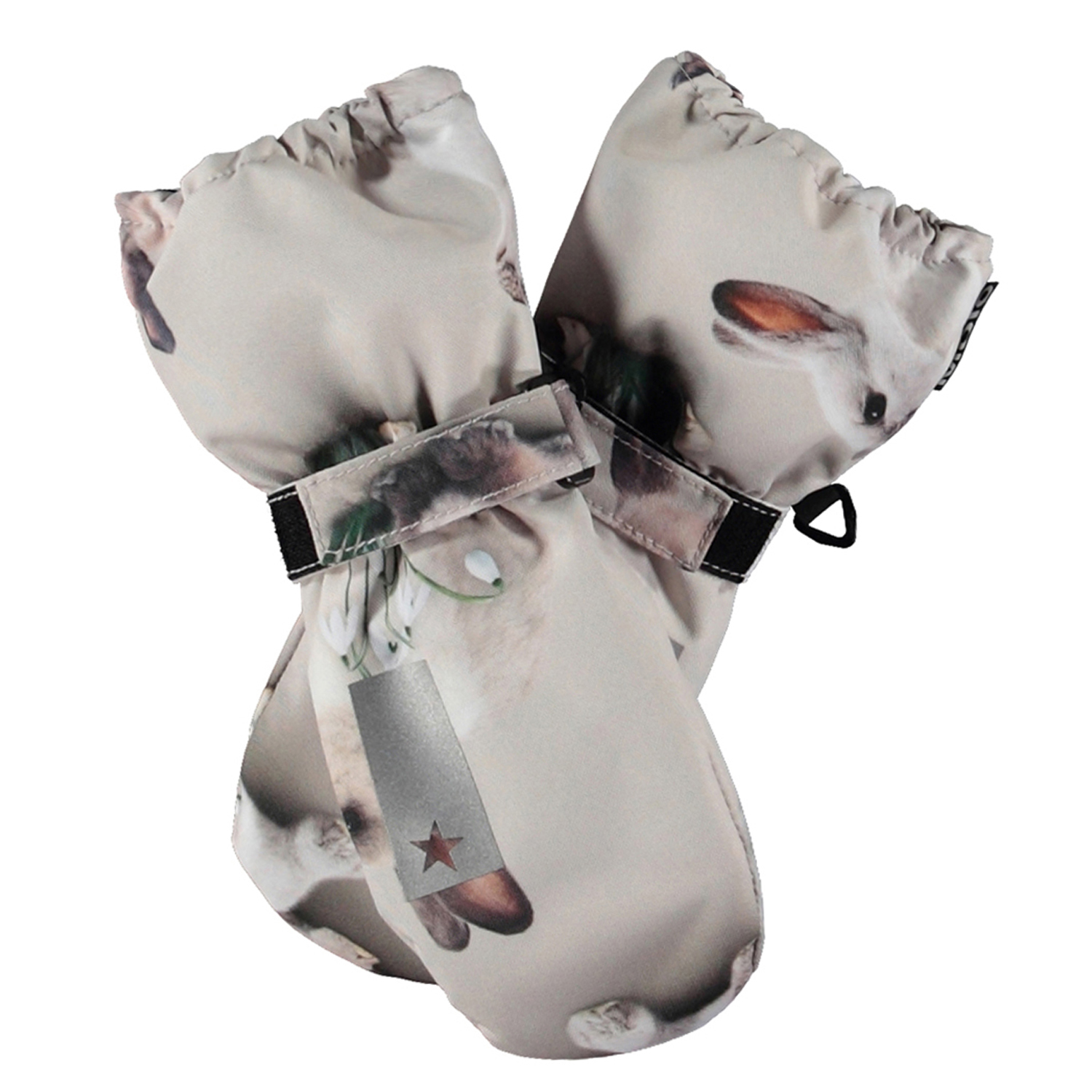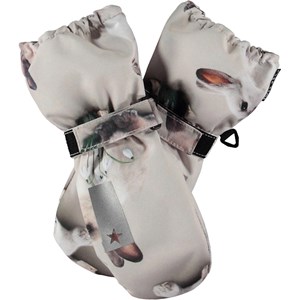 Lichtgrijze, waterdichte en ademende wanten met konijnenprint en 3M™ Thinsulate™ isolatie. De wanten hebben een reflector aan de voorkant, evenals elastiek en verstelbaar klittenband rond de pols. Let op dat de manchet van dit model iets langer is dan die van Mitzy, dus er is geen opening tussen de wanten en de jas mouw.