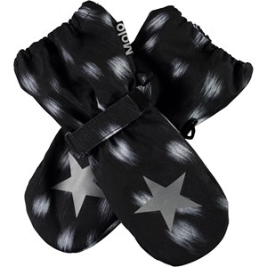 Waterdichte en ademende wanten met 3M ™ Thinsulate ™ isolatie in het zwart met witte vlekken. Ze hebben sterreflectoren op de bovenkant van de handen en elastisch en verstelbaar klittenband bij de polsen. De buitenstof is 51% gerecycled en gemaakt van gerecycled polyester. Let op dat de schacht bij dit model iets langer is dan bij de Mitzy, zodat er geen opening is tussen de want en de mouw van de jas. De wanten hebben een waterafstotende, PFC-vrije oppervlaktebehandeling (bevat bijvoorbeeld geen PFOS, PFOA, etc). Waterkolomdruk: 10.000 mm en ademend: 8.000 g / m2 / 24 uur. Maten 1-2 jaar hebben ook een ritssluiting aan de schacht.