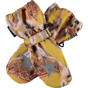 Waterdichte en ademende wanten met 3M ™ Thinsulate ™ isolatie in het geel met een hertenprint. Ze hebben sterreflectoren op de bovenkant van de handen en elastisch en verstelbaar klittenband bij de polsen. De buitenstof is 51% gerecycled en gemaakt van gerecycled polyester. Let op dat de schacht bij dit model iets langer is dan bij de Mitzy, zodat er geen opening is tussen de want en de mouw van de jas. De wanten hebben een waterafstotende, PFC-vrije oppervlaktebehandeling (bevat bijvoorbeeld geen PFOS, PFOA, etc). Waterkolomdruk: 10.000 mm en ademend: 8.000 g / m2 / 24 uur. Maten 1-2 jaar hebben ook een ritssluiting aan de schacht.