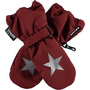 Donkerrode waterdichte en ademende wanten met 3M ™ Thinsulate ™ isolatie. Ze hebben sterreflectoren op de bovenkant van de handen en elastisch en verstelbaar klittenband bij de polsen. De buitenstof is 51% gerecycled en gemaakt van gerecycled polyester. Let op dat de schacht bij dit model iets langer is dan bij de Mitzy, zodat er geen opening is tussen de want en de mouw van de jas. De wanten hebben een waterafstotende, PFC-vrije oppervlaktebehandeling (bevat bijvoorbeeld geen PFOS, PFOA, etc). Waterkolomdruk: 10.000 mm en ademend: 8.000 g / m2 / 24 uur. Maten 1-2 jaar hebben ook een ritssluiting aan de schacht.