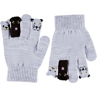 Grijze gebreide handschoenen met schattige dieren op drie van de vingers. De handschoenen hebben een geribbelde boord rond de pols waardoor het comfortabel is om te dragen en het voorkomt dat de handschoenen van de hand afglijden.