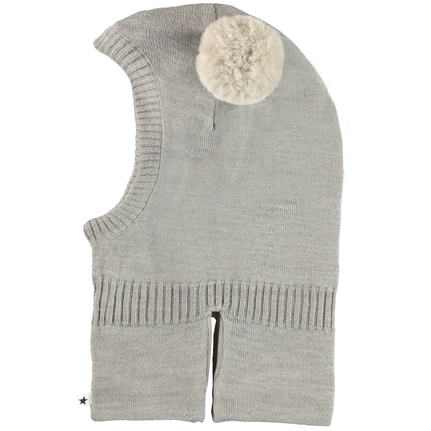 Grijze gebreide wollen bivakmuts. De muts heeft een kleine imitatiebont pompom en oortjes.