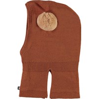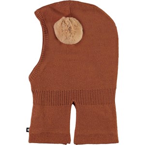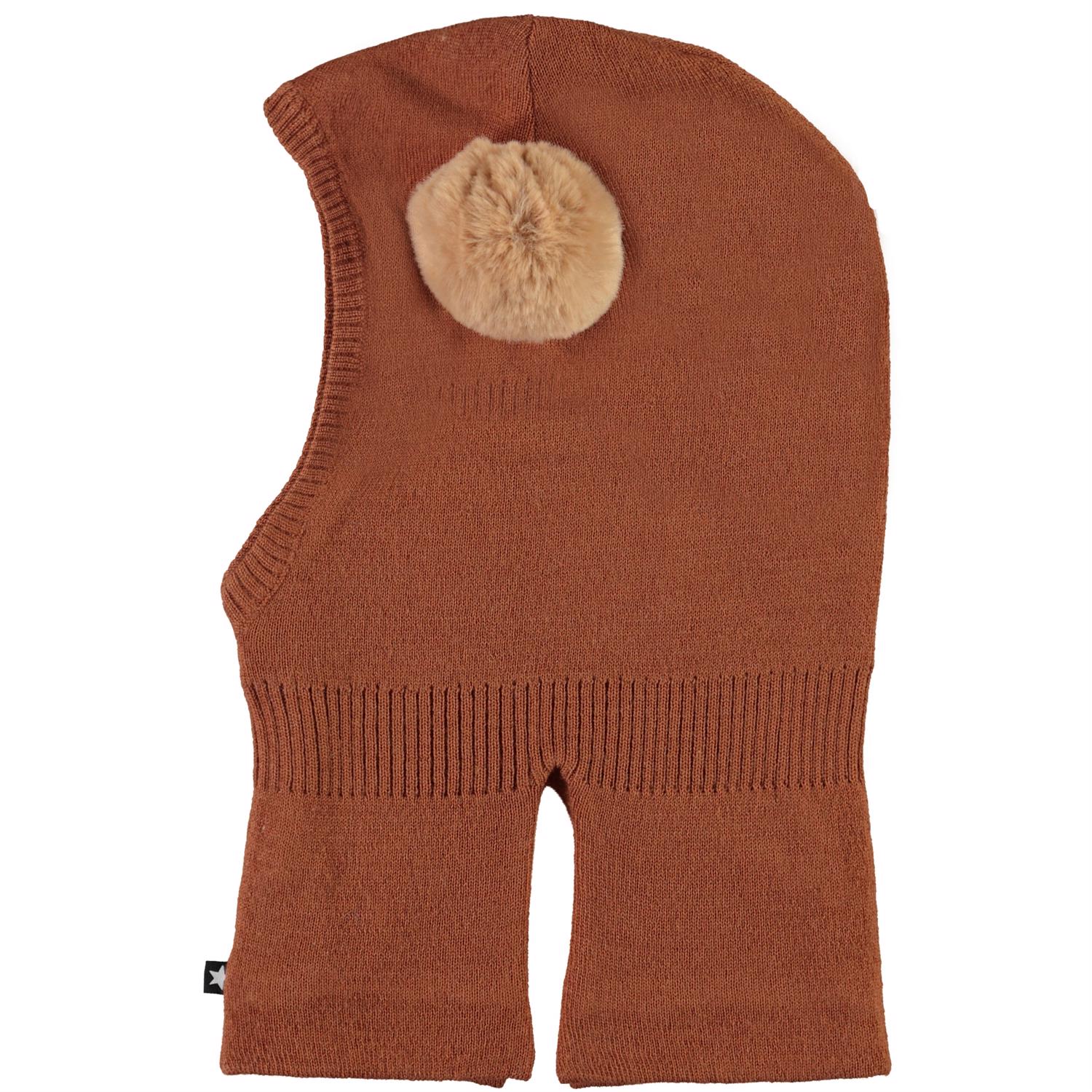 Bruine gebreide skimuts met een opgenaaide pompon van imitatiebont.