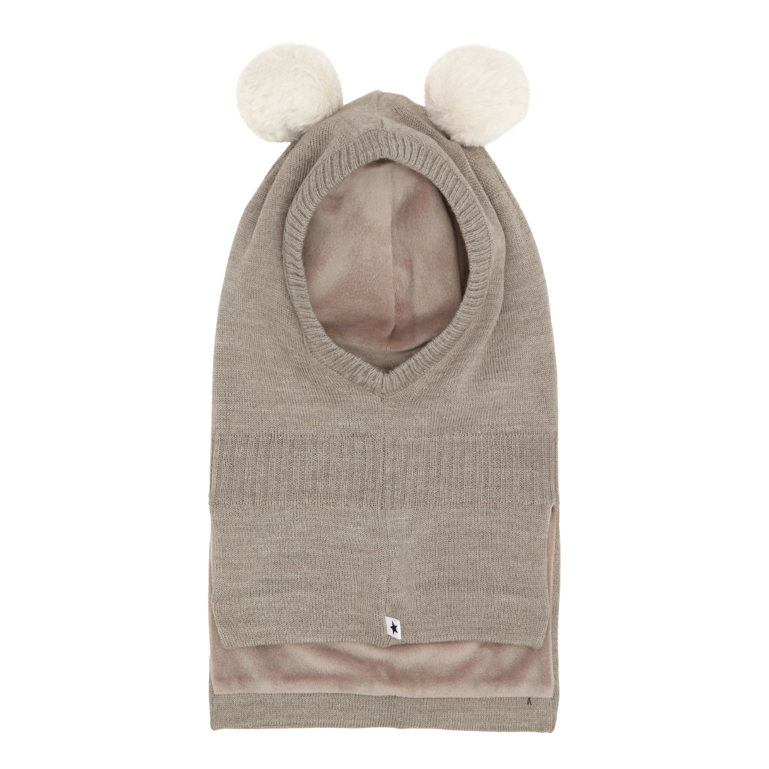 Grijze bivakmuts gebreid met imitiatiebont pom-poms. Het heeft inkepingen aan de zijkant van de hals zodat het goed past over de borst en schouders. Het is gemaakt van een zachte wolmix en gevoerd met pluche stof.