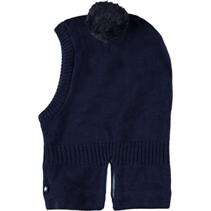 Donkerblauwe gebreide bivakmuts van wol. De muts heeft kleine pompons oren van imitatiebont.