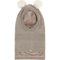 Donkergrijze bivakmuts gebreid met imitiatiebont pom-poms. Het heeft inkepingen aan de zijkant van de hals zodat het goed past over de borst en schouders. Het is gemaakt van een zachte wolmix en gevoerd met pluche stof.