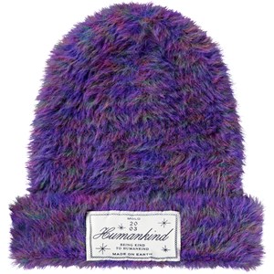 Paarse pluizige muts met omslag en een patch aan de voorkant met de tekst 'Humankind - Being Kind to Humankind' gemaakt met veelkleurig garen.