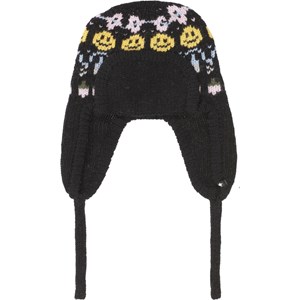 Zwart gebreide muts met een patroon en smiley''s. De muts heeft oorflappen die onder de kin vastgemaakt kunnen worden wat zorgt voor een goede pasvorm.