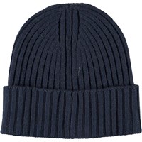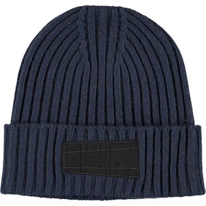 Blauwe gebreide muts van wol met omslag en Molo's nieuwe label aan de voorkant.