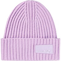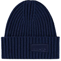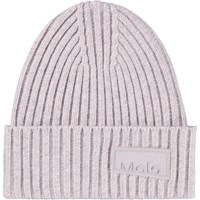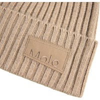 Bruine gebreide muts in rib met omslag en het logo van Molo aan de voorkant.