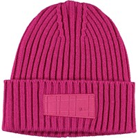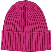 Een gebreide kabelmuts van een roze wol met een omslag aan de onderkant en Molo's logo op de voorkant.