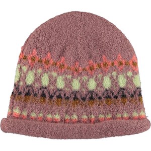 Lichtroze gebreide muts in alpaca wol. De muts heeft een prachtig patroon.