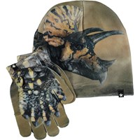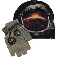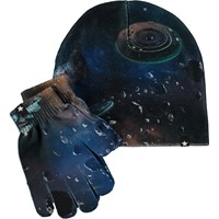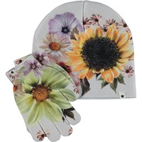 Bijpassende set muts en handschoenen in lichtblauw met een print van bospaddenstoelen en kleine dieren. Maat S/M 3-6 jaar. Maat M/L 7-12 jaar.
