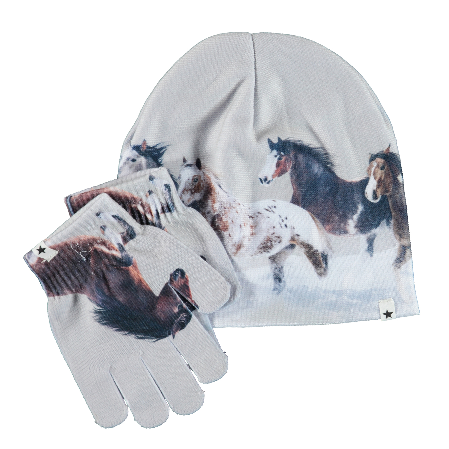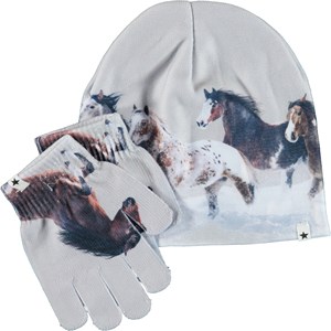 Bijpassende set van muts en handschoenen met een print van paarden. S/M: 3-6 jaar. M/L: 7-12 jaar.