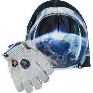 Bijpassende set van muts en handschoenen met een print van de aarde vanuit de ruimte gezien. S/M: 3-6 jaar. M/L: 7-12 jaar.