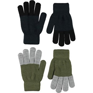 2 Paar gevoerde gebreide handschoenen. Een paar is donkerblauw met zwarte vingers en de andere is groen met lichtgrijze vingers.