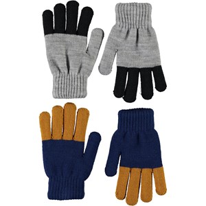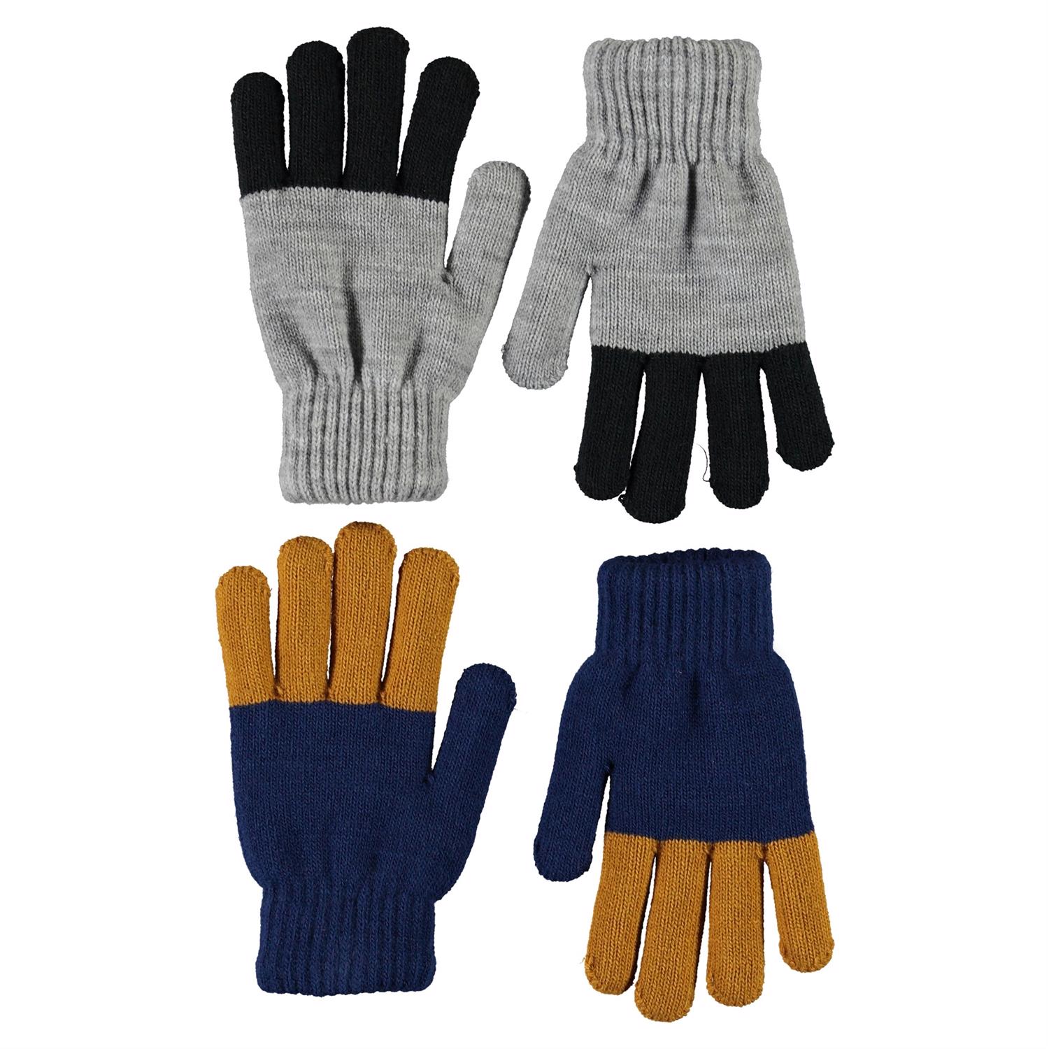 Twee paar gebreide handschoenen. Het ene paar is grijs met zwarte vingers, terwijl het andere blauw is met donkergele vingers.