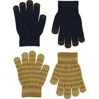 Twee paar gebreide handschoenen. Een paar is lichtroze met gele vingertoppen en de ander is gestreept in donkerblauw en wit.