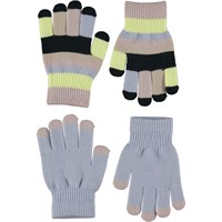 Twee paar gebreide handschoenen. Het ene paar is groen met zwarte vingertoppen en het andere paars met zwarte strepen.