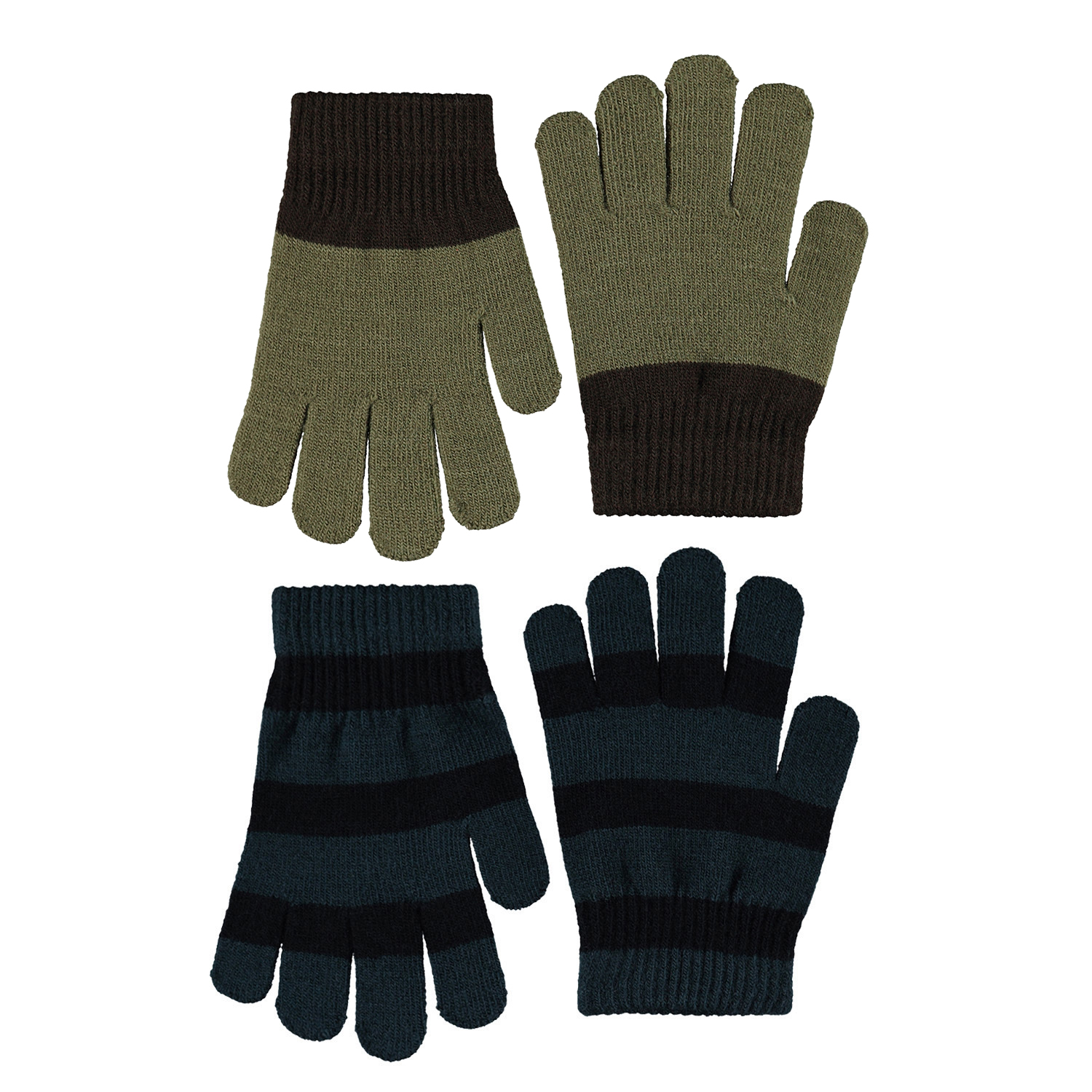 Duo pak gebreide handschoenen in groene en zwarte strepen. De handschoenen hebben een geribbelde boord rond de pols waardoor het comfortabel is om te dragen en het voorkomt dat de handschoenen van de hand afglijden.