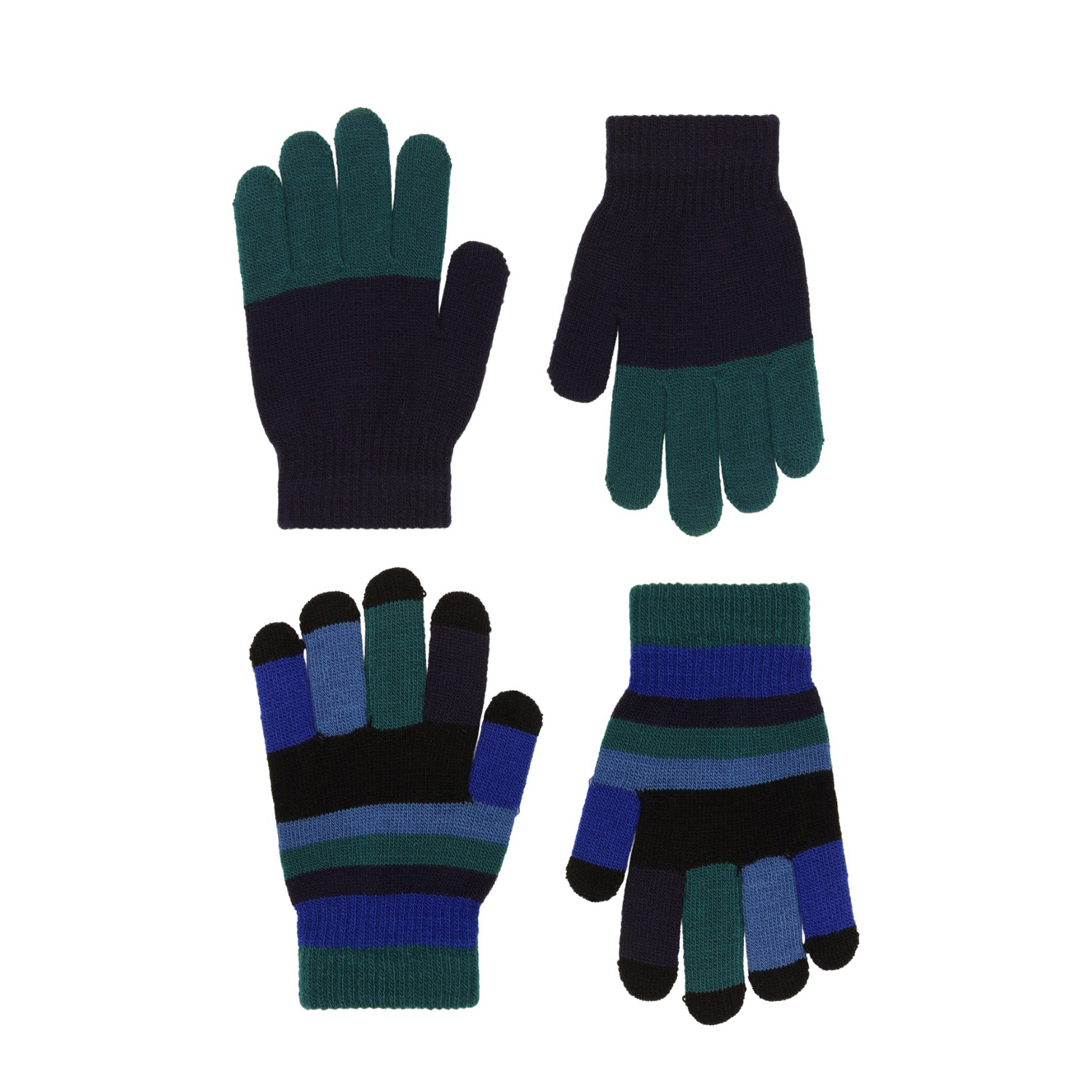 Duopak gebreide handschoenen. Een paar is zwart met zeegroen details, terwijl het andere paar gestreept is in zwart, groen en marineblauw. De handschoenen hebben een geribbelde manchet rond de pols, waardoor ze comfortabel zijn om te dragen en het voorkomt dat ze makkelijk uitgaan.