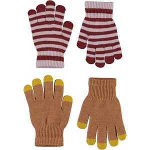 2 Paar gebreide handschoenen. Een paar is beige met lichtgele vingertoppen en de ander is lichtroze en rood gestreept.