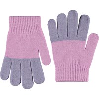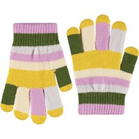 Duo pak van gebreide handschoenen. Eén in tinten paars en de andere in groen en paarse strepen. De handschoenen hebben een geribbelde boord rond de pols waardoor het comfortabel is om te dragen en het voorkomt dat de handschoenen van de hand afglijden.