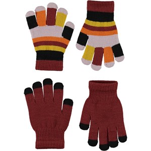 2 Paar gebreide handschoenen. Een paar is donkerrood met zwarte vingertoppen en de ander is gestreept.