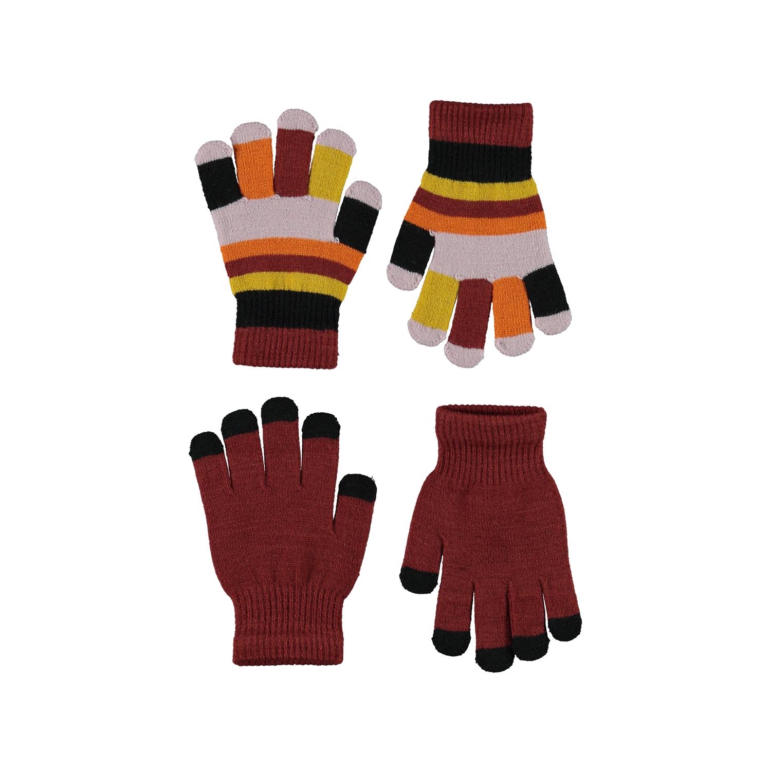 2 Paar gebreide handschoenen. Een paar is donkerrood met zwarte vingertoppen en de ander is gestreept.