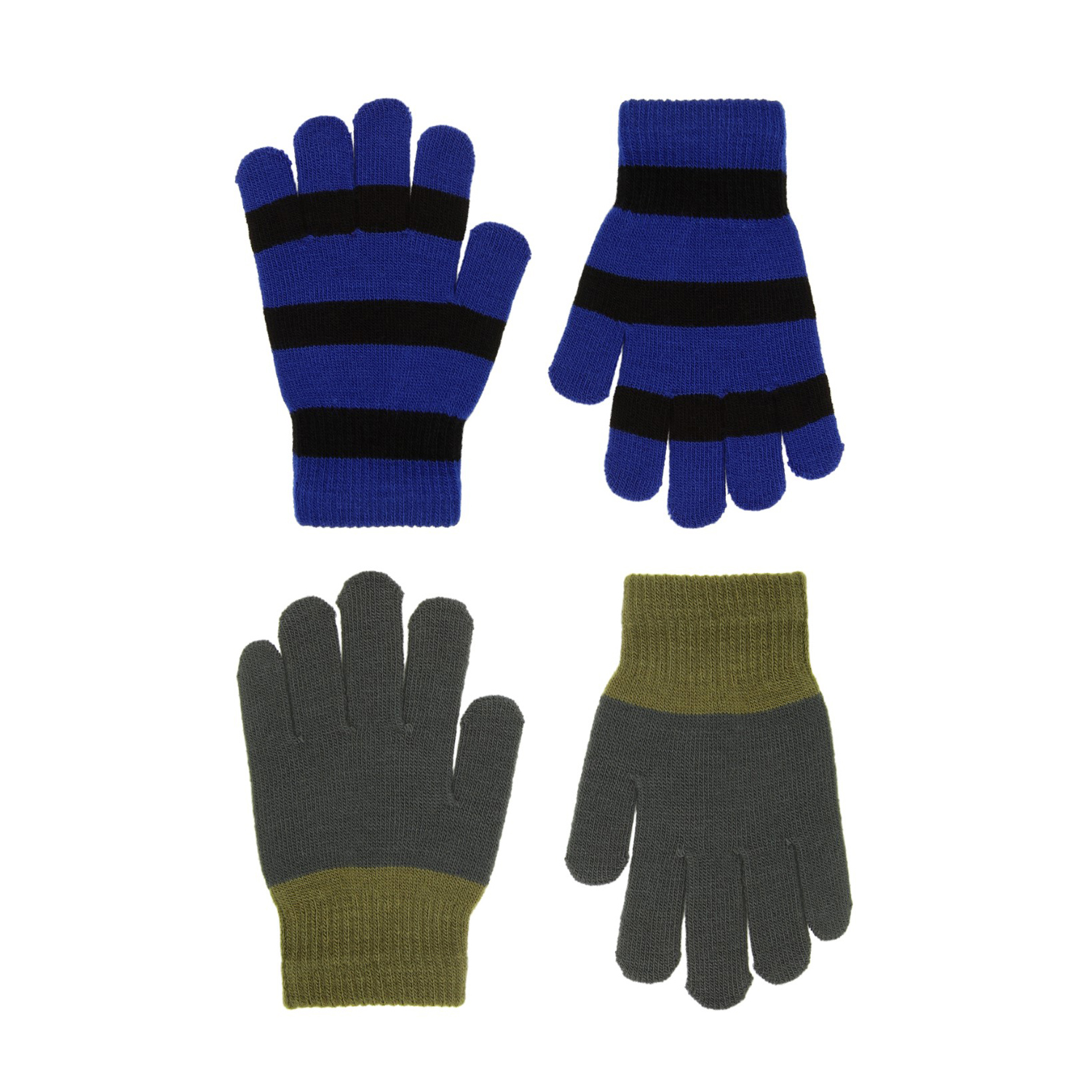 Duopak gebreide handschoenen. Een paar is groen, terwijl het andere paar gestreept is in zwart en marineblauw. De handschoenen hebben een geribbelde manchet rond de pols, waardoor ze comfortabel zijn om te dragen en het voorkomt dat ze makkelijk uitgaan.