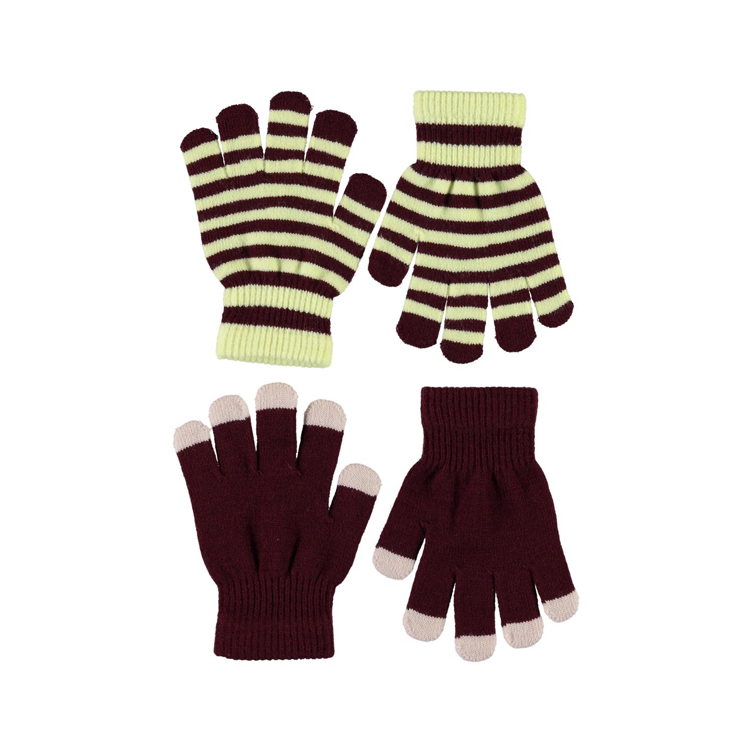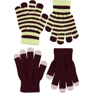 Twee paar gebreide handschoenen. Een paar is bordeaux rood met licht gekleurde vingertoppen, terwijl het andere gestreept is.