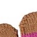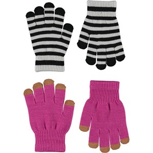 2 Paar gebreide handschoenen. Een paar is roze met bruine vingertoppen en de ander is zwart en grijs gestreept.
