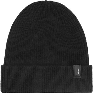 Zwarte gebreide wollen muts met het logo van Molo op de omslag.