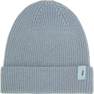 Blauwe geribbelde wollen muts met het logo van Molo op de omslag.